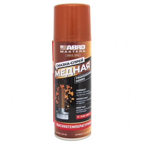 Медная высокотемпературная смазка спрей ABRO 200 мл предназначена для смазки резьбовых соединений, направляющих суппортов, тормозных дисков, шпилек и других элементов, работающих при высоких температурах до 1000°C.